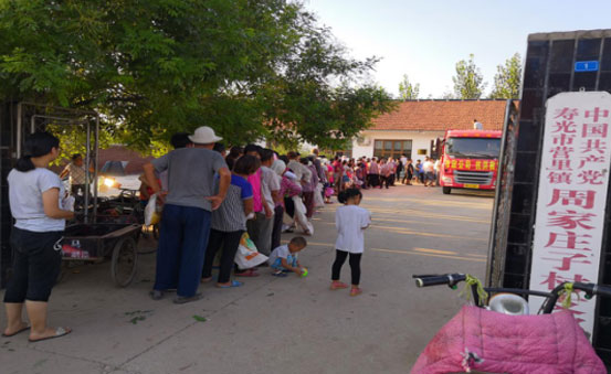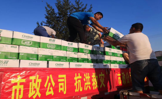 2018年8月25日,由公司董事長、總經理王曉軍帶隊,將738箱礦泉水、7950斤掛面和114箱方便面等價值48906元的應急救災生活物資送到受災嚴重的營里鎮(zhèn)周家村和吳家村賑濟災民。