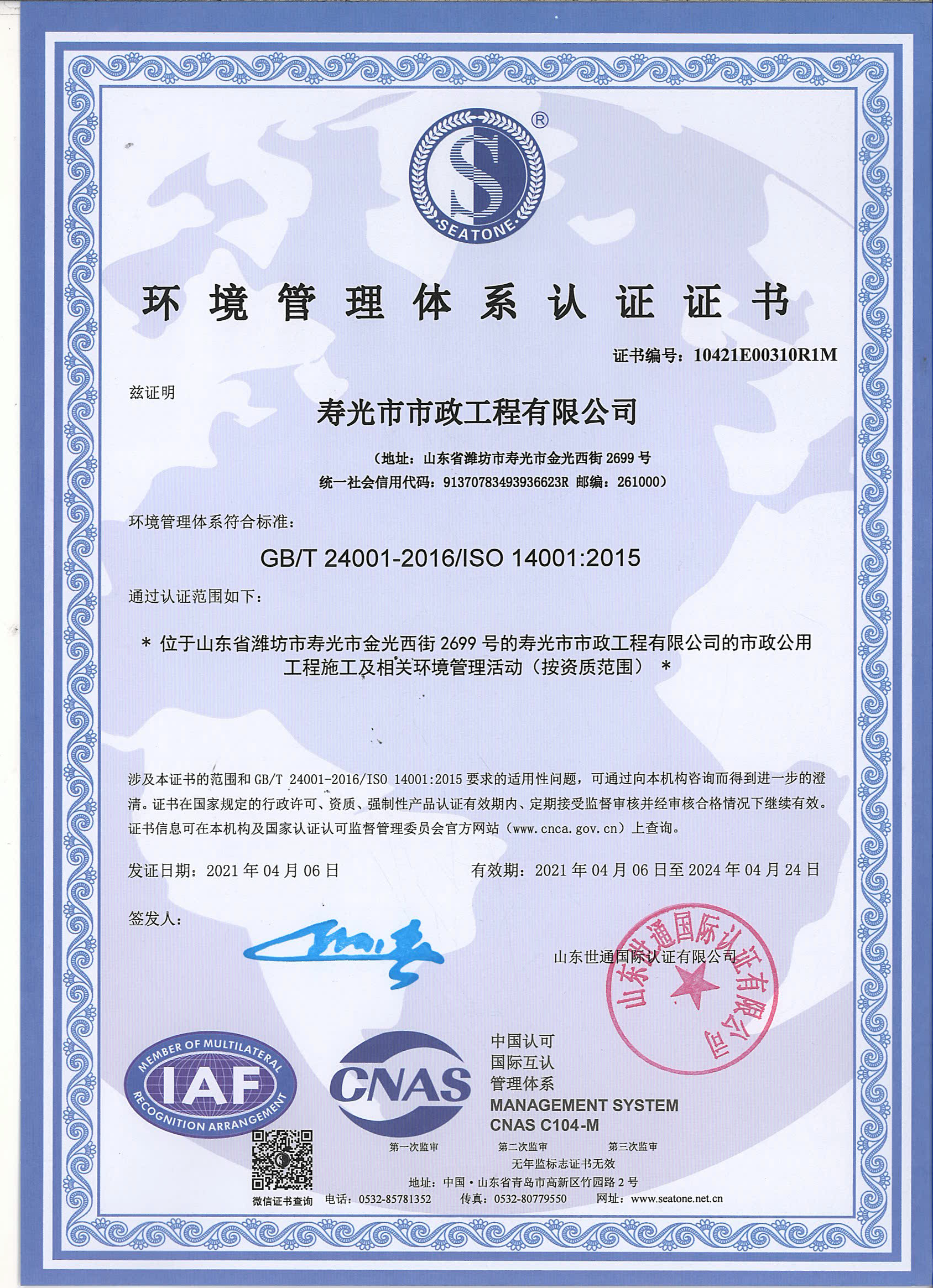 環(huán)境管理體系認證證書