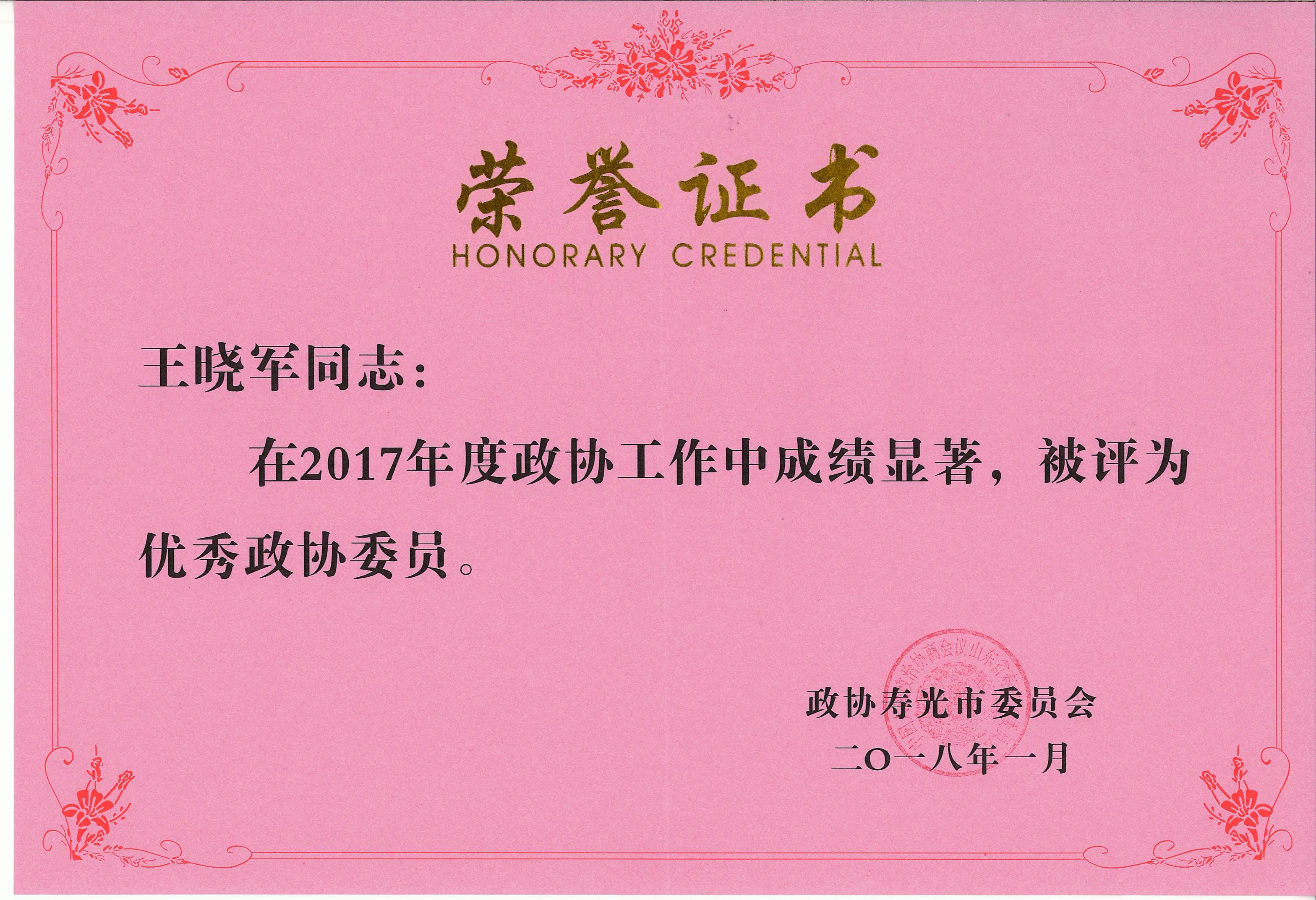 公司董事長、總經(jīng)理王曉軍同志因在2017年度政協(xié)工作中表現(xiàn)突出,被政協(xié)壽光市委員會評為**政協(xié)委員。