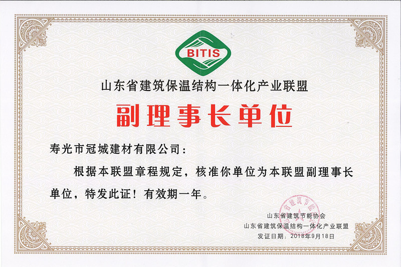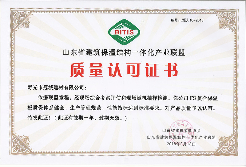 冠城建材公司產(chǎn)品獲得山東省建筑保溫結(jié)構(gòu)一體化產(chǎn)業(yè)聯(lián)盟質(zhì)量認(rèn)可證書。