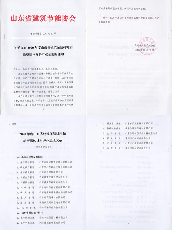 為了支持山東省建筑保溫材料和新型墻體材料行業(yè)骨干企業(yè)發(fā)展,推動行業(yè)轉(zhuǎn)型升級和科技進(jìn)步,根據(jù)《山東省建筑節(jié)能協(xié)會產(chǎn)業(yè)基地管理辦法》要求,山東省建筑節(jié)能協(xié)會確定我公司等18家企業(yè)為2020 年度山東省建筑保溫材料和新型墻體材料產(chǎn)業(yè)基地。