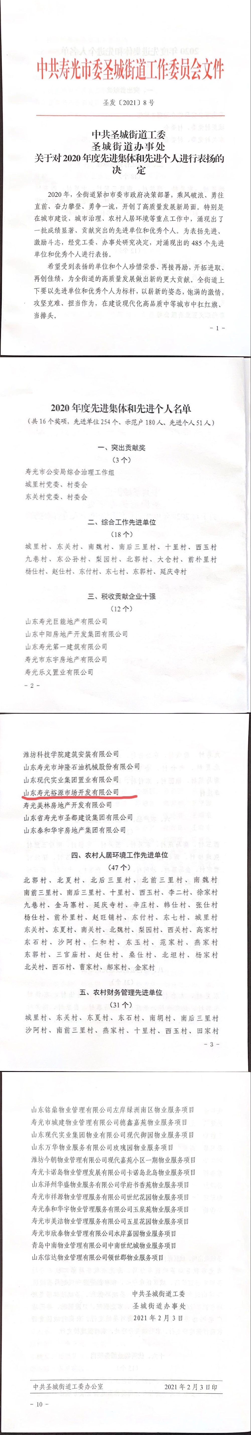 2021年3月,新正泰控股公司山東壽光裕源市場(chǎng)開(kāi)發(fā)有限公司被中共壽光市圣城街道工作委員會(huì)授予“稅收貢獻(xiàn)企業(yè)十強(qiáng)”榮譽(yù)稱號(hào)。