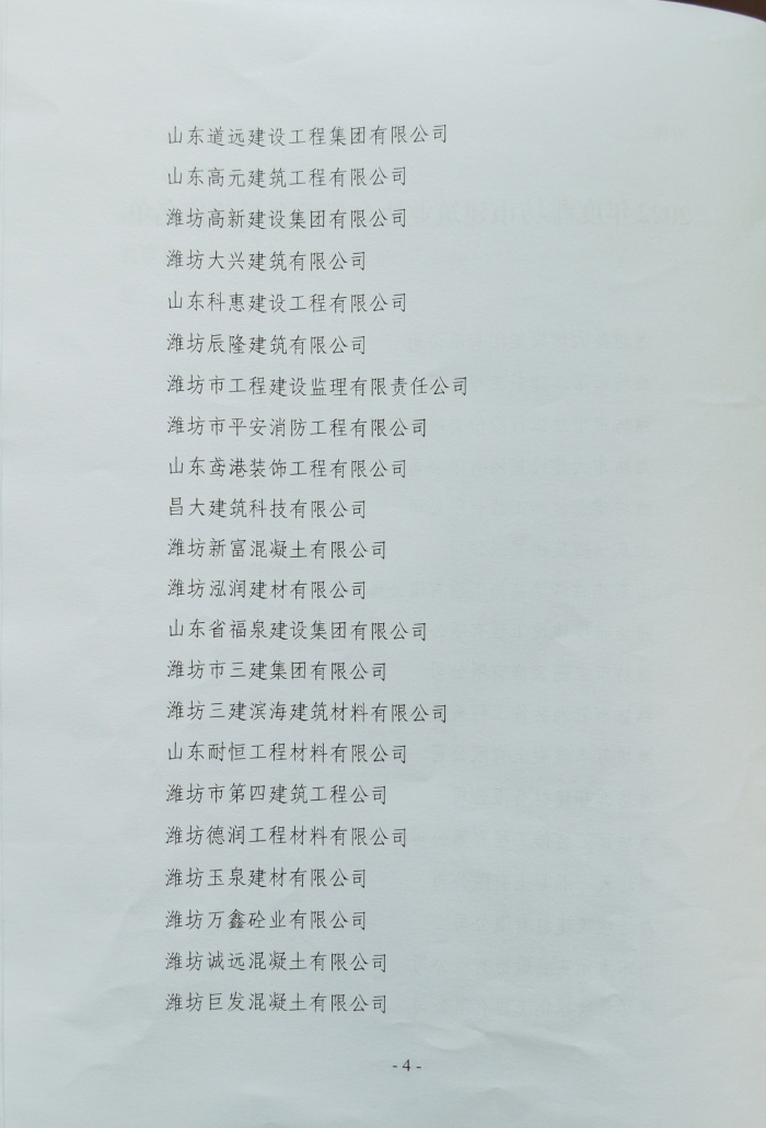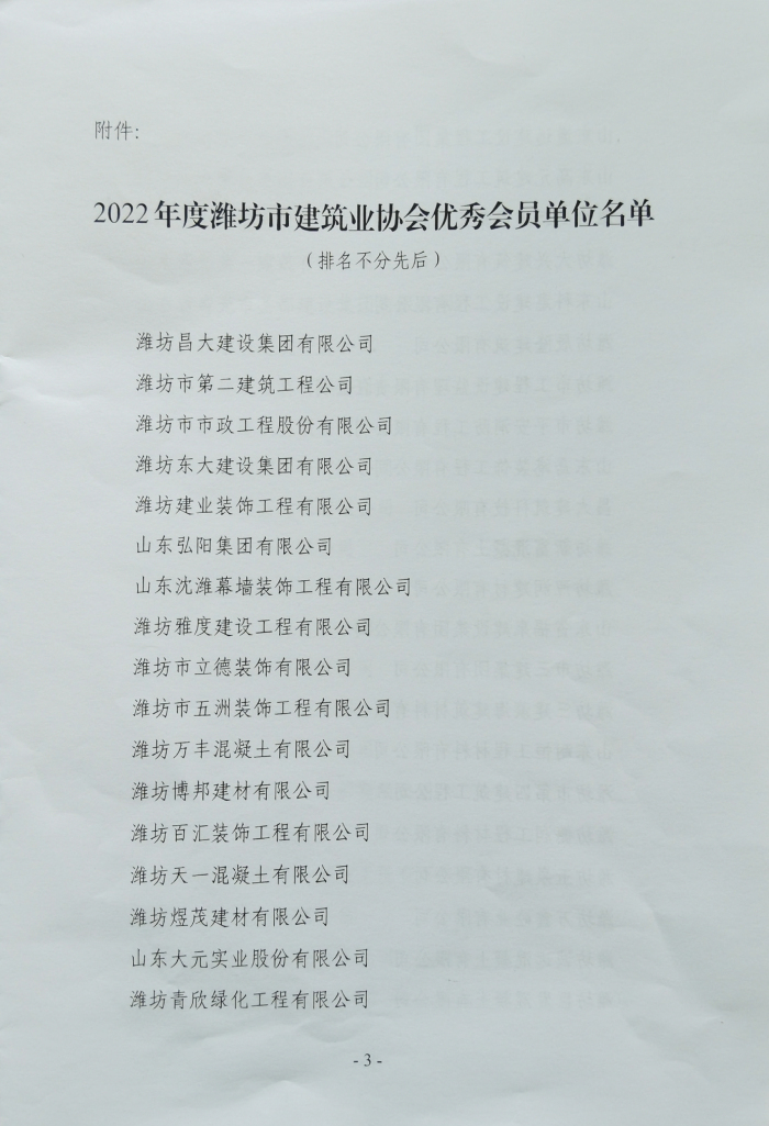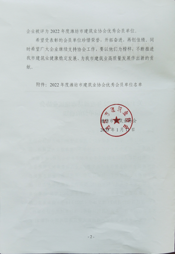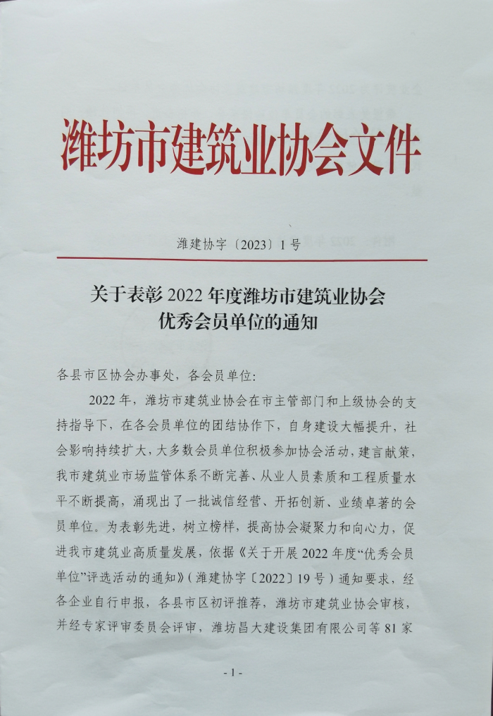 近日,濰坊市建筑業(yè)協(xié)會(huì)下發(fā)文件,公布了2022年度濰坊市建筑業(yè)協(xié)會(huì)優(yōu) 秀會(huì)員單位名單,我單位位列其中。此榮譽(yù)的獲得,充分體現(xiàn)了公司在我市建筑業(yè)的綜合競(jìng)爭(zhēng)優(yōu)勢(shì),彰顯了行業(yè)地位,是對(duì)公司從業(yè)人員素質(zhì)、工程質(zhì)量和企業(yè)管理水平等工作的肯定和認(rèn)可。